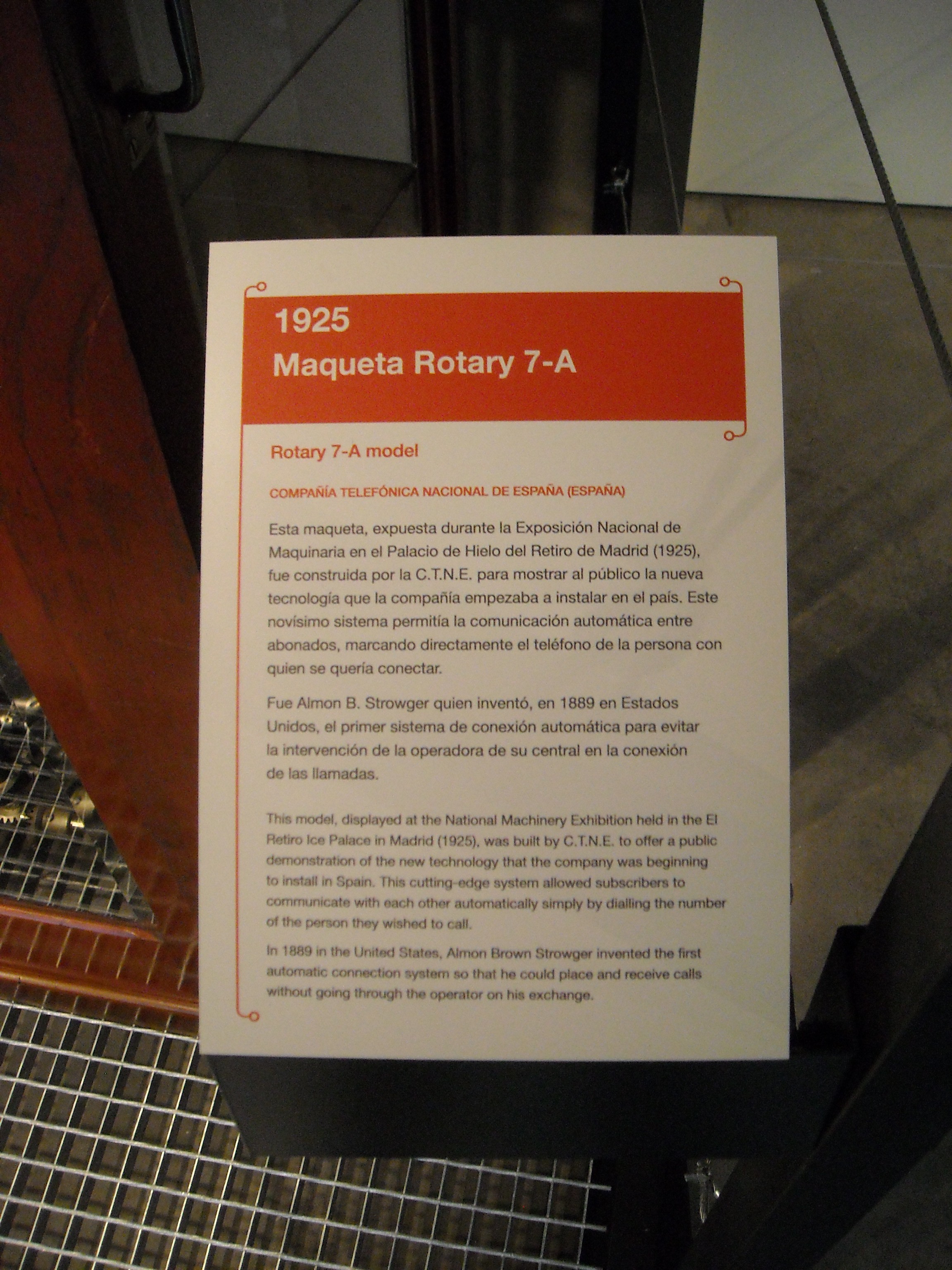 En cuanto a los equipos citados, es de destacar el ya mencionado Rotary 7A, único en España, que se montó en 1925 por la CTNE y que fue expuesto en diferentes exposiciones de la época. Este equipo lo podemos en varias de las fotos que se exponen en otros museos (Canena y La Coruña) en el caso de la Exposición Nacional de Maquinaria del Palacio de Hielo del Retiro de Madrid en 1925.