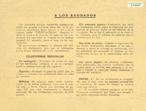 Dorso Telefonema 1930. Archivo Histórico EA4DO