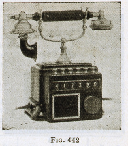 Teléfono con marcación por pulsadores y visor. Enciclopedia Espasa tomo 60 fig 442. 1928